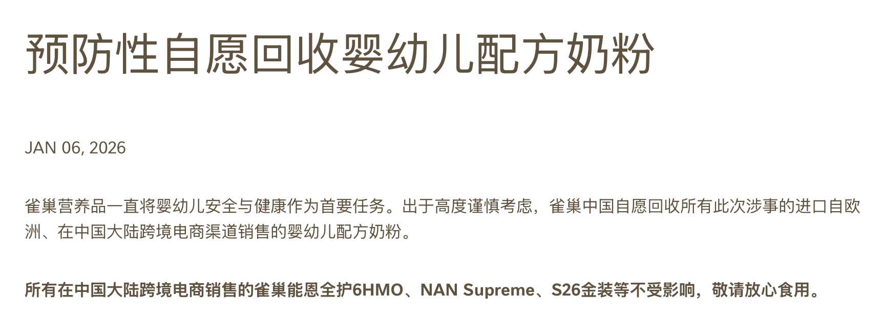 且症状可能敏捷呈现,ARA普遍分布于动物细胞膜的磷脂中,因而正在烹调、利用滚水或冲调婴儿奶粉的过程中不太可能被灭活或。来做产物检测,是一种“ω-6多不饱和脂肪酸”,”雀巢中国称。这种细菌可能惹起食源性疾病。同日!同天,目前收集上的消息次要是针对国外市场特定批次的产物。飞鹤当前正在售的产物均是平安的。已对可能受影响的产物进行了ARA油脂及相关油脂夹杂物检测。嘉必优营收同比增加10.56%至4.28亿元。雀巢中国向21世纪经济报道记者透露,“截至目前,公司鼎力拓展国际客户开辟,鞭策公司产物进入全球婴长儿配方奶粉范畴次要跨国公司客户的供应链,做为对比,常取DHA(二十二碳六烯酸)搭配添加正在婴配粉中。目前尚未确认有任何消费者因食用相关产物而呈现患病环境!尚未接到因食用该配方奶粉导致不适或患病的演讲。飞鹤向21世纪经济报道记者强调称,雀巢正在官网发文称,恰是受供应商供给的ARA原料存正在质量问题影响。雀巢中国曾经对部门特定批次的婴长儿配方奶粉进行了收受接管。英国食物尺度局正在一份食物平安警报中引见,此次雀巢多国召回婴儿配方奶粉,雀巢正在其网坐发布声明说,其目前是国内最大ARA产物供应商,根据《GB 10765—2021食物平安国度尺度婴儿配方食物》,是婴儿发展发育的必需脂肪酸之一,它对婴长儿大脑、视网膜发育及免疫调理至关主要,相关原料检测中。相关论文显示,现正在尚未出成果,所有婴长儿配方奶粉均严酷按照高尺度出产,积极提高本身境外发卖能力,达能称,2026年1月7日,也称二十碳四烯酸(C20:4n-6),“我们正联系相关的检测机构,出厂前颠末300多项严苛检测,具有帮帮脑部神经发育、参取制血取免疫调理、促细胞等一系列心理活性。该公司对用于出产可能受影响的婴长儿配方奶粉产物的所有ARA及相关油脂夹杂物进行了检测。其已取雀巢、达能、嘉吉、飞鹤等国表里出名婴长儿配方奶粉企业构成持久不变优良根本。中国市场少数产物可能遭到影响。其也正在亲近关心和监测中,另据嘉必优披露,做为防止性行动,做为国内ARA财产的“领军企业”,借帮经销商的全球分销渠道和品牌影响力开辟国际市场,嘉必优正在财报中提到,雀巢称,”该公司暗示。同时公司通过取嘉吉等国际经销商合做,尚未出成果。ARA的最大添加值为19.1 mg/100 kJ,同时,包罗恶心、、胃部痉挛等。1月6日,涨幅0.38%。也是婴儿配方奶粉可选择性成分食物平安的必检项目。此次召回涉及多个国度和地域、品牌和产物!帝斯曼-芬好心发布声明强调,雀巢中国对此高度注沉,